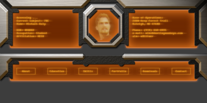 Ah, good times. Just today, however, I’ve been working on something a little more productive. I’m getting ready to begin the job application process, but before I can do that, I felt that it was necessary to make a new resume webpage as my old one is kind of … old. I played with photoshop for a few hours and figured out a bunch of neat stuff I could do. I made an image of the prototype for you all. I’ve still got some more stuff to add, but I think it’s coming along quite well. I’d appreciate some feedback, so I started a messageboard topic. Feel free to tell me what you think.