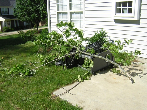 When I returned home, apparently a tornado had come through the area. There was lots of leaves and pine needles and stuff in the road, but generally no big deal. I didn’t think much of it until I noticed that in my back yard some random tree landed on my grill. This is very mysterious; there was no debris this size anywhere else and I don’t know of any trees of this type even remotely close to my back yard.