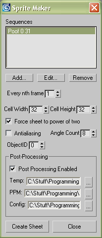Sprite Maker is a utility that runs inside of 3ds Max. I wrote it in Max’s built-in scripting language, MaxScript. I’m not going to go on about every little feature it has; just look at the options and use your imagination. The main point of the tool is that once I’ve created and animated a 3d scene:
