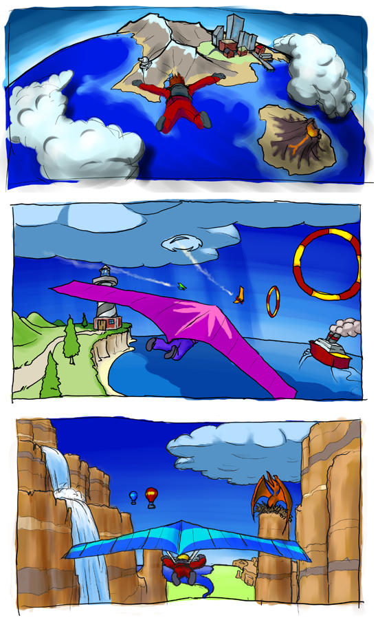 I was really happy with how good of a turnout we got for project proposals. In the end, we had to settle down to two projects to divide the team between and my proposal was one of the ones that got voted on. My proposal (entitled "Glide") was to make a game where players control a skydiver that can deploy or retract hang-gliding wings at any time. The goal is to get the highest score you can on a single drop where contributing factors are how smooth your landing was, the value of the landing platform you ended up on, how many floating rings you passed through on the way down, and any bonus objectives. You can think of it as combining the relaxing pace and exploration of Pilotwings with the reward mechanisms and social aspects of Monkey Target.