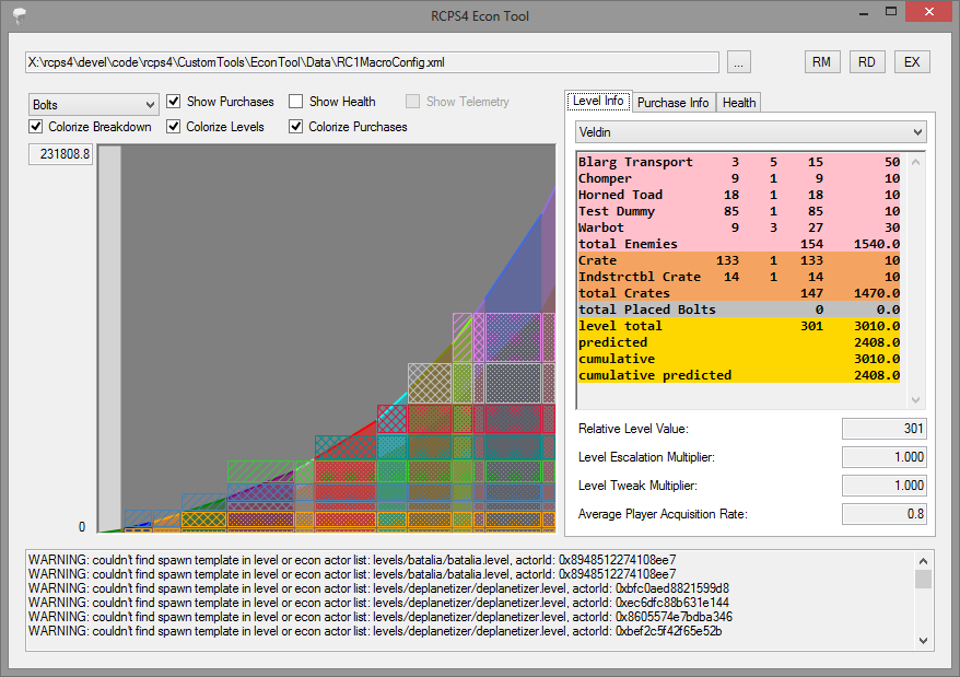 One of my favorite parts was creating the Econ Tool. This is a C# winforms app that I created to help tune all aspects of the economy. It basically scrapes all of the levels for all sources of potential income and gives you a way to input some tuning values and it outputs final income values for each type of thing you can get income from to ensure that drops are always consistent yet escalate as you get further. It also predicts how much income the player will have at any given point in time and maps this against the available purchases or level up thresholds or whatever; building a colorful graph that you can use to assess whether purchase prices are reasonable. That’s just the currency stuff, it does all sorts of other things like judging weapon power levels (with and without predicted upgrades) over the course of the game, and how well enemy HP is going to stand up to that at various points.