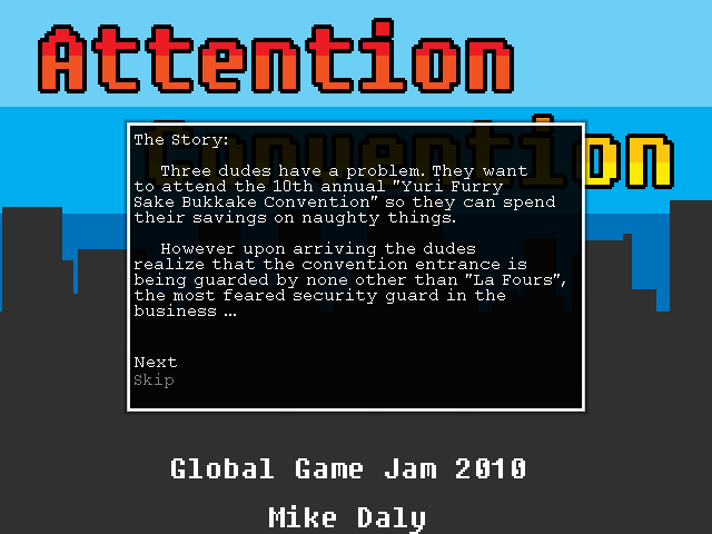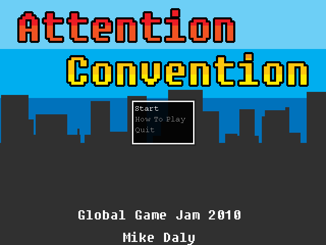 Attention Convention is a game I created in 48 hours for the 2010 Global Game Jam. The theme for the jam was to make a game that centered around the concept of DECEPTION and our regional constraint was that the game had to include one of the following things; a SET, a NET, or a PET.