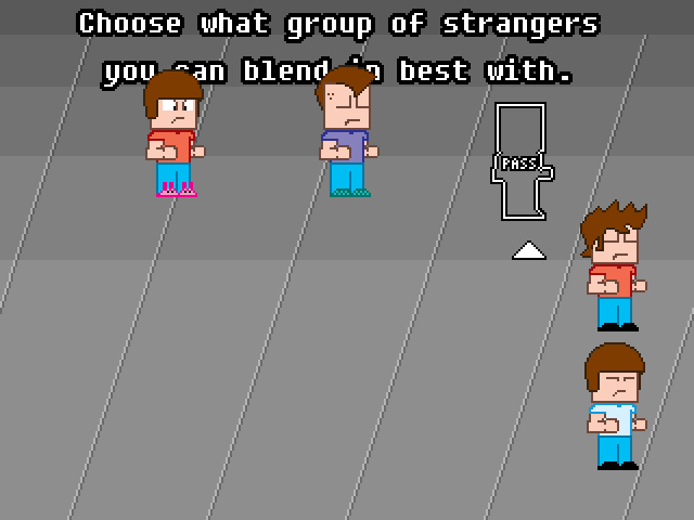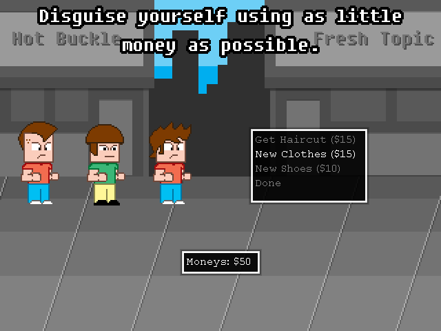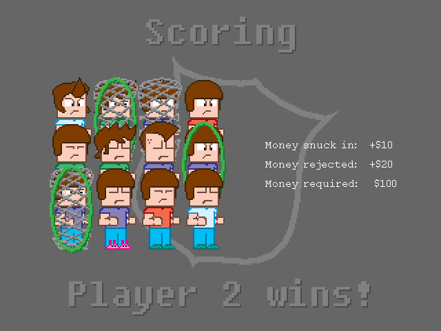 The concept that I came up with was a multiplayer game where one player was trying to help a group of underage dudes sneak past security into an adults-only convention and the other player tries to pick the dudes out of a crowd. The first player can purchase changes to their appearance that make them harder to pick out of the crowd, at the cost of risking not bringing enough money into the convention. The second player can net anyone he wants, but netting legal attendees makes the first player have to bring less money to the convention to win.