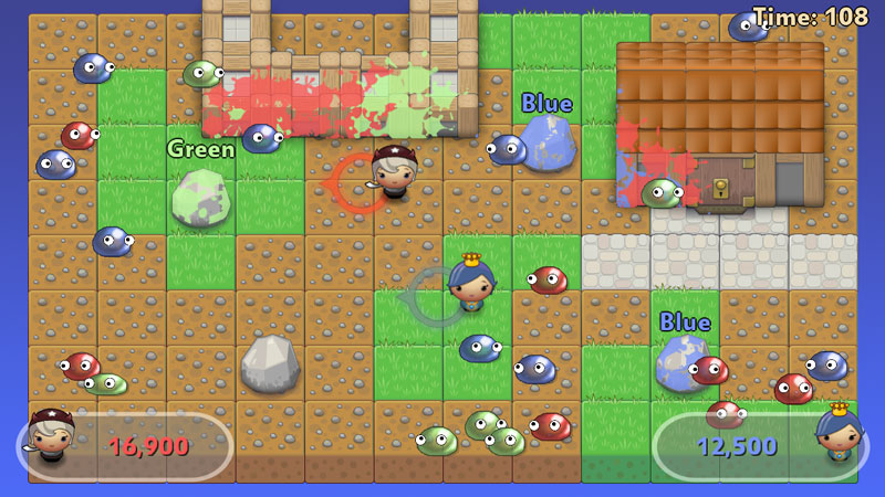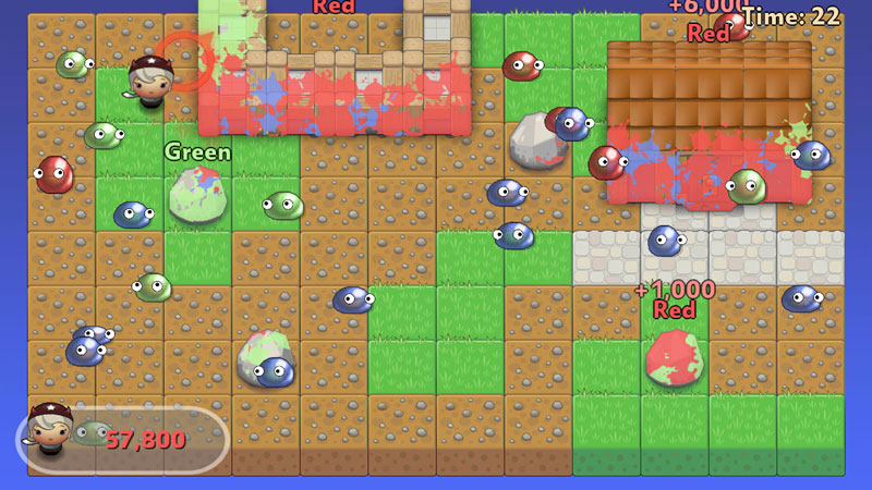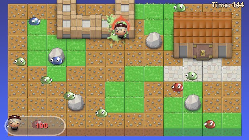 In any case, we started out with a pretty vague idea of what we wanted the main game mechanics to be, and honestly, didn’t clarify it a whole lot over the course of development. In the end, there was a valid game system in place where you could get points and stuff, but really the reward for playing all along comes in the visceral feedback you get when you stomp on slam a slime into a wall and they explode goo everywhere. It’s pretty fun, you should try it.
