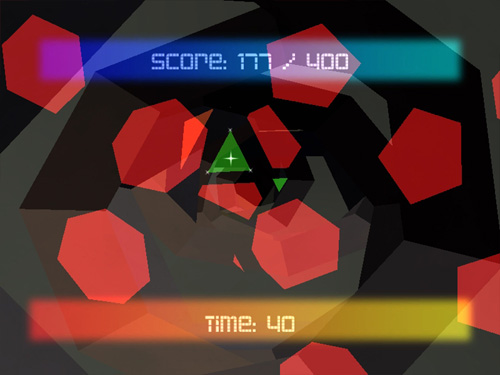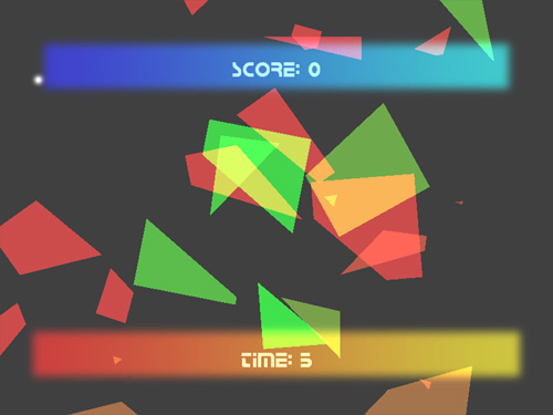 Shape Slasher is a game where randomly generated irregular convex polygons float on screen and you have to ‘slash’ them down into shapes that are as close to equilateral triangles as you can get them. To slash, you click and drag with the mouse to determine the two endpoints of a line segment. When you release the mouse, any polygons that are under the segment get clipped into two polygons and slowly seperate. Each level has a time limit in which you must achieve a particular score to pass. As the stages go on, the shapes become more irregular, move faster, get smaller, increase in rotational velocity, and the required score increases. Just for good measure, there are a few bonus and challenge stages thrown in.